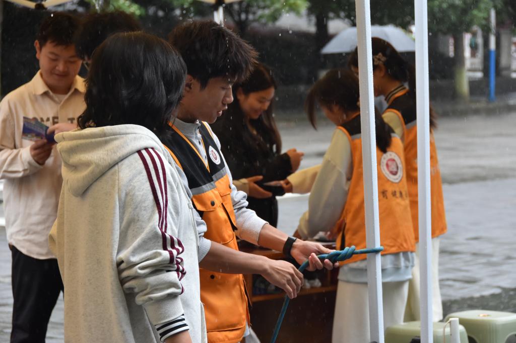 “自由参与+集章兑换”机制更添意趣。学子们怀揣集章卡笺,在雨中风致独具的体验中,领略中医“治未病”的养生哲思。师生教学相长,雨中共话健康之道,现场秩序井然又生机盎然,充分彰显学院不畏艰难、团结奋进的精神气象。