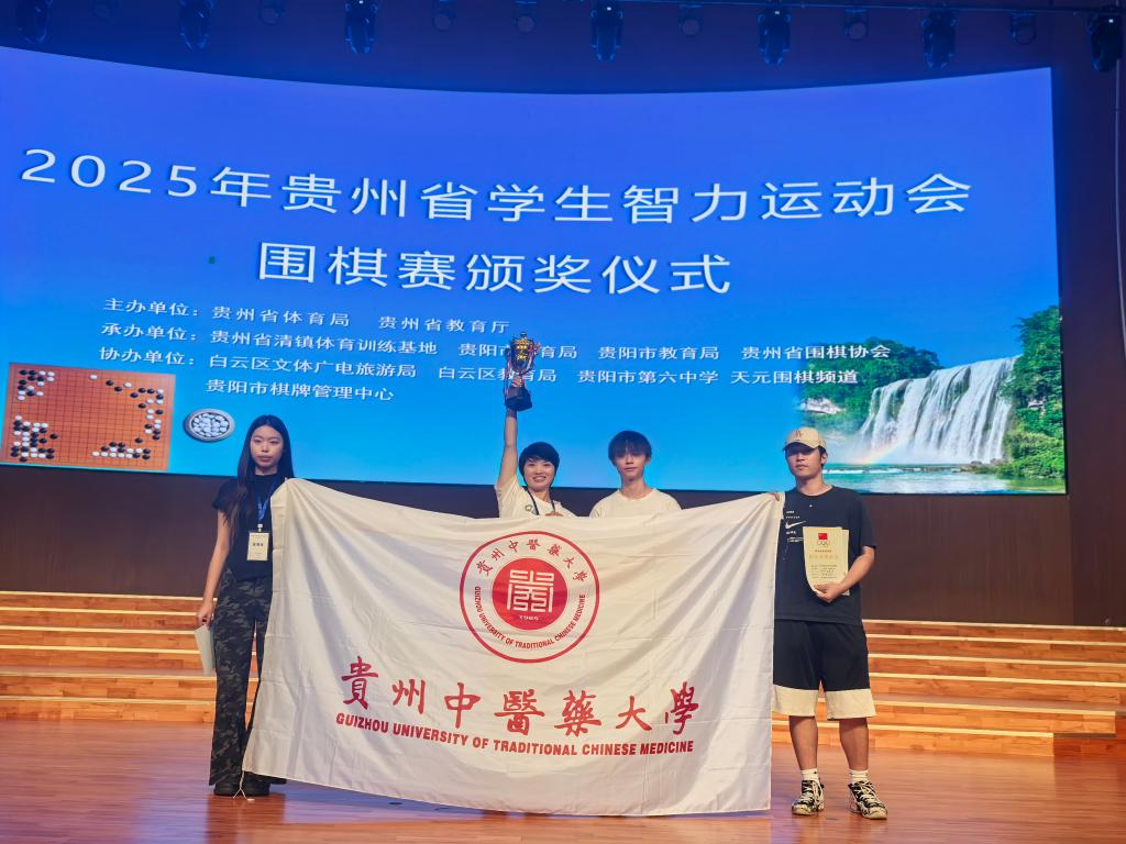 在8月16日至17日于贵阳市第六中学(白云校区)举行的2025年贵州省学生智力运动会围棋赛上,我校代表队由2021级针灸推拿(1)班的张添文博、2023级中医养生班的赵浩君、2022级袁家玑班的李沁镅组成,经过2天共6轮的角逐,荣获团体第三名的优异成绩!张添文博同时荣获大学生组个人第一名,李沁镅荣获女子个人第六名。